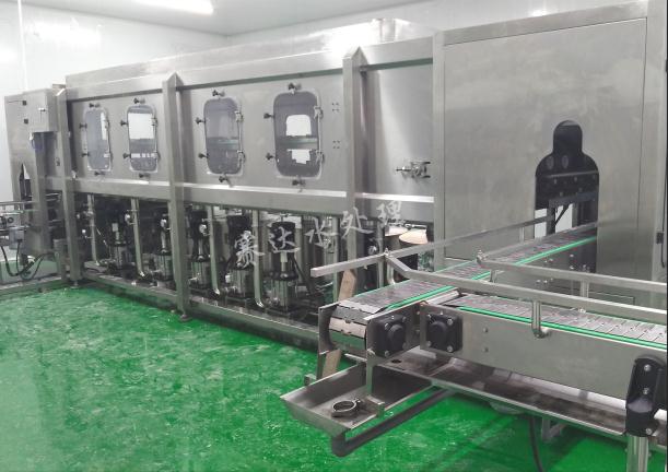桶裝水灌裝機集消毒、沖洗、灌裝、封蓋于一體,其沖洗工位為:一道瀝干、兩道熱堿液噴洗、一道滴干、兩道自來水噴洗、兩道回用水噴洗、一道滴干四道消毒液噴洗、一道滴干、兩道成品水噴洗、一道滴干(沖洗工位可以根據(jù)客戶需求做14-20道),在此過程中,桶的外部也利用噴射頭進行了相應的噴洗,通過提升裝置,將所有噴射頭往上提升,深入空桶內(nèi)部,對桶內(nèi)部進行徹底的消毒、噴洗。通過自動下桶裝置將清洗后的空桶送入灌裝位置,并進行灌裝,過程中溢出的水將回流到純水箱,避免成品水的浪費。灌裝后的大桶由輸送鏈帶其依次進行掛蓋和封蓋。